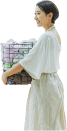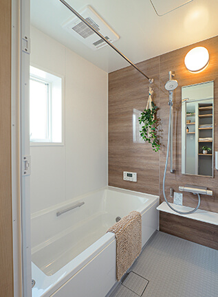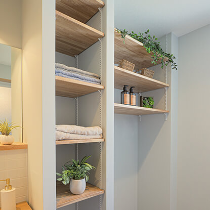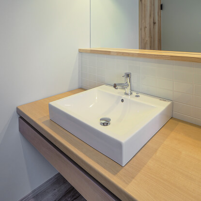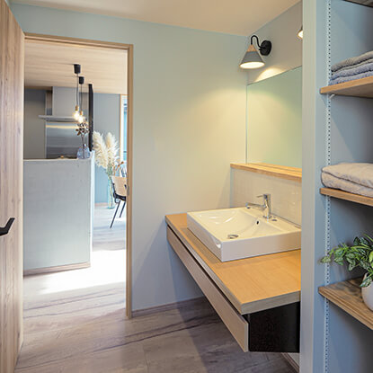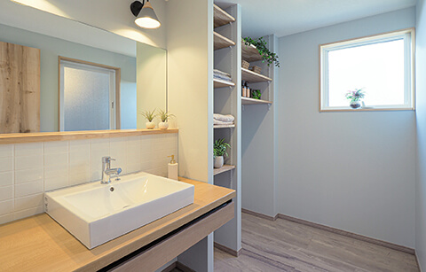 タイルをアクセントにした洗面所と稼働棚を設けた脱衣室で、おしゃれと使いやすさを両立。リビングと同じ素材を使うことで空間全体の統一感を出しました。