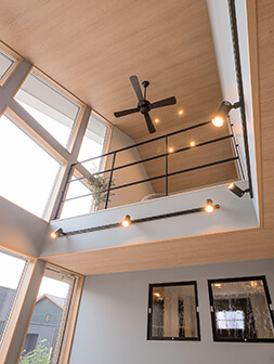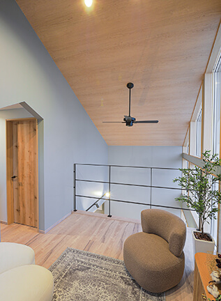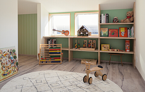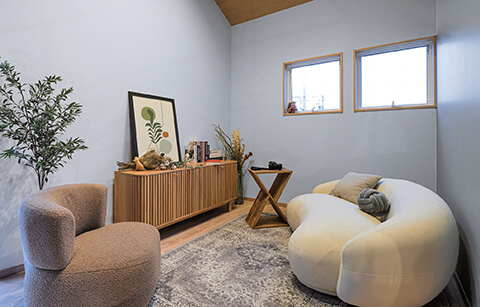 建築時は仕切らずに広いまま使い、スクリーンを設けて子どもとアニメを見たり、お昼寝、雨が降ったら洗濯物を干すなど、自由に使える部屋。