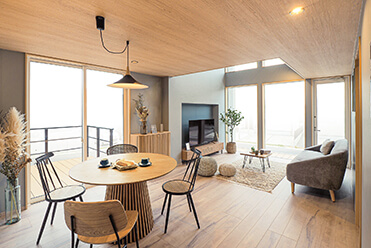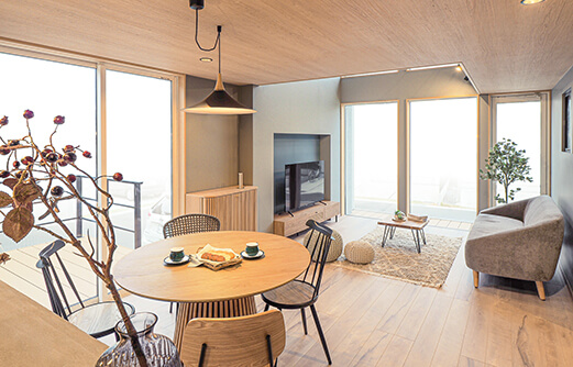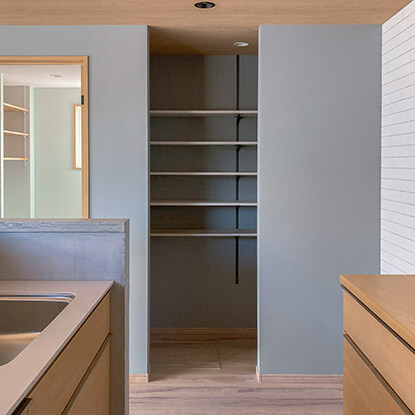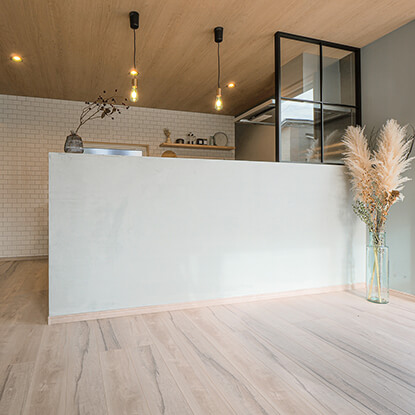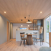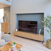 木目とブルーグレーをテーマカラーにしたLDK。上品なブルーグレーに木目をバランスよく調和させることで、ぬくもりや安らぎを感じることができる空間となっています。