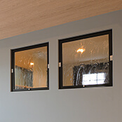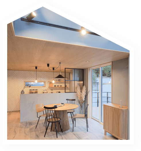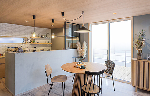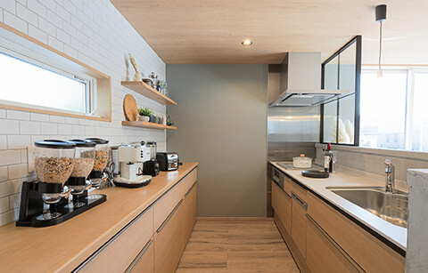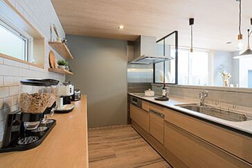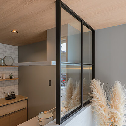 モルタルの腰壁とアイアン窓が特徴のかっこいいキッチンも、背面タイルと木目天井を採用することで温かみを感じられます。さらに、この食洗機付きのキッチンは、シンクも広々。調理スペースが広いので、料理をする時も快適です。