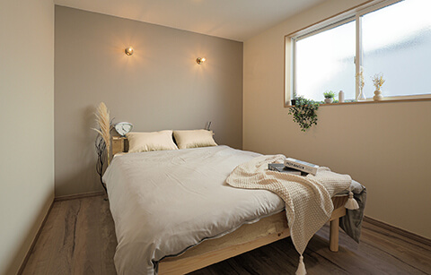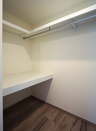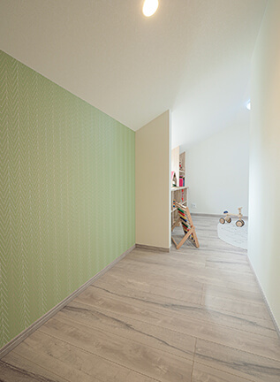 ピスタチオグリーンと日の光が相まって、開放的で明るいお部屋に。壁一面の収納棚は、ボックスを使って物を仕分けて収納することも可能ですし、見せる収納として飾りながら仕舞うこともできます。大容量収納も備え付けです。